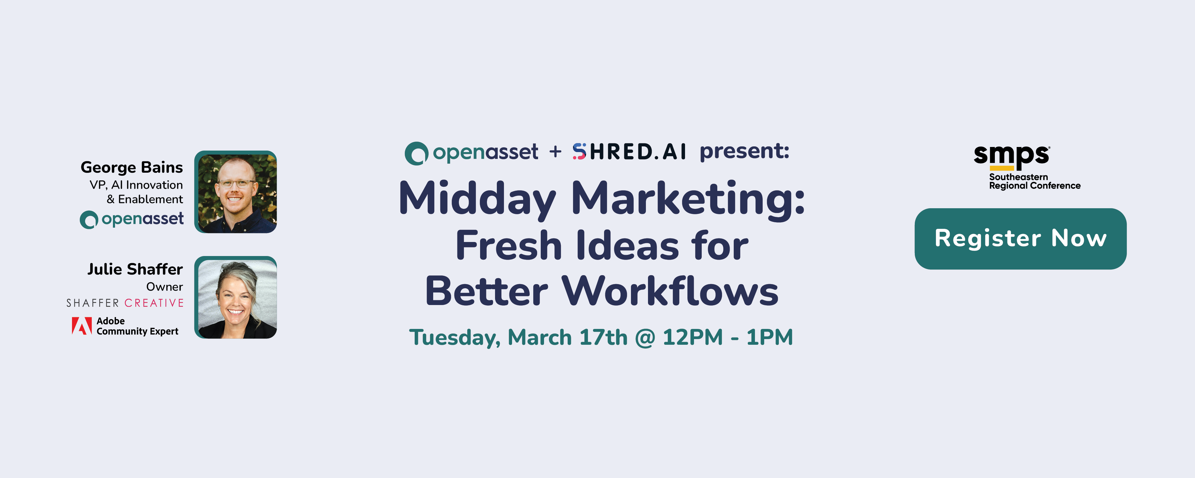 Join George Bains of OpenAsset and Julie Shaffer of Shaffer Creative for a fun, energetic lunch & learn workshop designed to help you improve your marketing & proposal workflows. Whether you're an OpenAsset or Shred.ai customer looking to connect with other users, are a marketer who's curious to see what's new in AEC tech, or simply want to gather some fresh workflow ideas from our expert duo, there's something for you.
